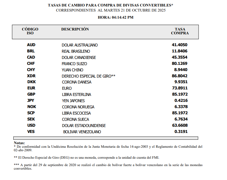 Las tasas de cambio del Banco Central para la compra y venta del Dólar Estadounidense, al cierre del 21 de octubre de 2025, son de RD$63.6608/US$ y RD$64.1735/US$, respectivamente.